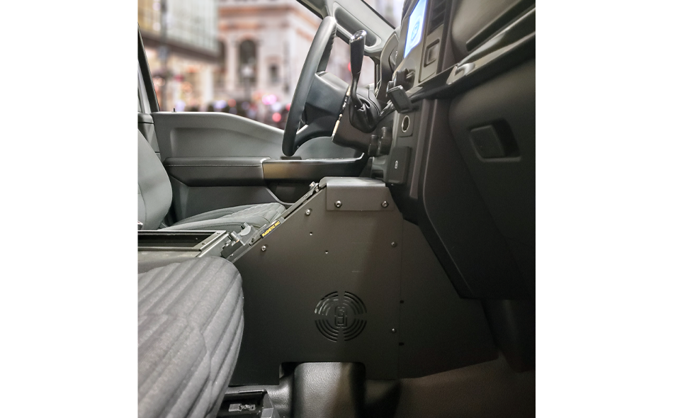 The 2021+ Ford F-150 Wide Body Console Box Kit with Magnetic Phone Holder, Cup Holder, Rear Armrest, and Mongoose® XLE 9" Motion Attachment, provides ample mounting and storage space between the front seats while keeping laptops and devices easily accessible with a full range of motion.