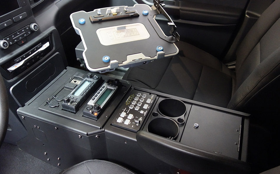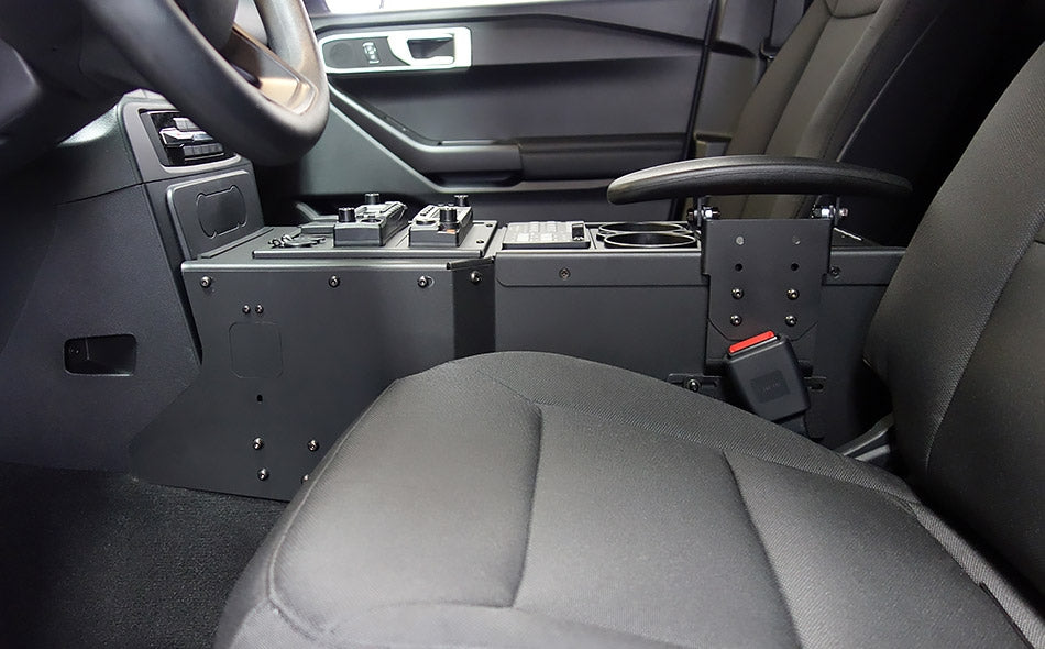 ALL NEW Full Depth Console Kit with Side Mount, Armrest, and Cup Holder for the 2020+ Ford Police Interceptor® Utility. Accommodates one-piece radios and controls.